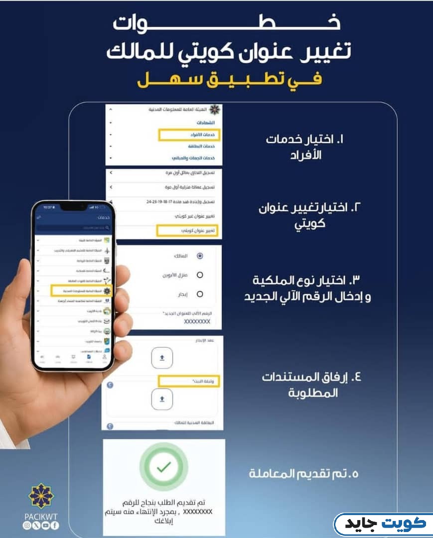 يمكنك تغيير العنوان إلكترونيًا عبر تطبيق سهل الحكومي بعد تسجيل الدخول واختيار خدمة تغيير العنوان (كويتي- غير كويتي)، وإضافة البيانات ورفع المرفقات اللازمة، من ثم إرسال الطلب.